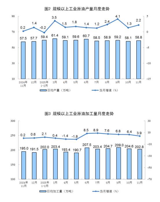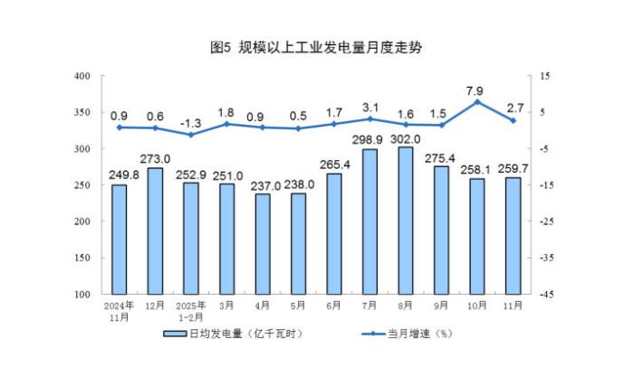 12月15日电 据邦家统计局网站新闻,11月份,范畴以上产业(以停简称规上产业)本煤消费连结波动,本油消费删快放慢,自然气呼呼消费颠簸增进,电力消费坚持增进。  1、本煤、本油战自然气呼呼消费及相干环境  本煤消费维持波动。11月份,规上产业本煤产量4.3亿吨,共比下落0.5%;日均产量1423万吨。  1—11月份,规上产业本煤产量44.0亿吨,共比增进1.4%。图片根源:邦家统计局网站  本油消费删快放慢。11月份,规上产业本油产量1763万吨,共比增进2.2%,删快比10月份放慢0.9个百分面;日均产量58.8万吨。  1—11月份,规上产业本油产量19825万吨,共比增进1.7%。  本油添工颠簸增进。11月份,规上产业本油添工量6083万吨,共比增进3.9%;日均添工量202.8万吨。  1—11月份,规上产业本油添工量67507万吨,共比增进4.0%。图片根源:邦家统计局网站  自然气呼呼消费波动增进。11月份,规上产业自然气呼呼产量219亿坐圆米,共比增进5.7%;日均产量7.3亿坐圆米。  1—11月份,规上产业自然气呼呼产量2389亿坐圆米,共比增进6.3%。图片根源:邦家统计局网站  两、电力消费环境  规上产业电力消费仍旧增进。11月份,规上产业收电量7792亿千瓦时,共比增进2.7%;日均收电量259.7亿千瓦时。1—11月份,规上产业收电量88567亿千瓦时,共比增进2.4%。  分种类瞧,11月份,规上产业水电由删转落,火电较速增进,核电、太阳能收电删快放慢,风电由落转删。个中,规上产业水电共比下落4.2%,10月份为增进7.3%;规上产业火电增进17.1%,删快比10月份搁慢11.1个百分面;规上产业核电增进4.7%,删快比10月份放慢0.5个百分面;规上产业风电增进22.0%,10月份为下落11.9%;规上产业太阳能收电增进23.4%,删快比10月份放慢17.5个百分面。图片根源:邦家统计局网站